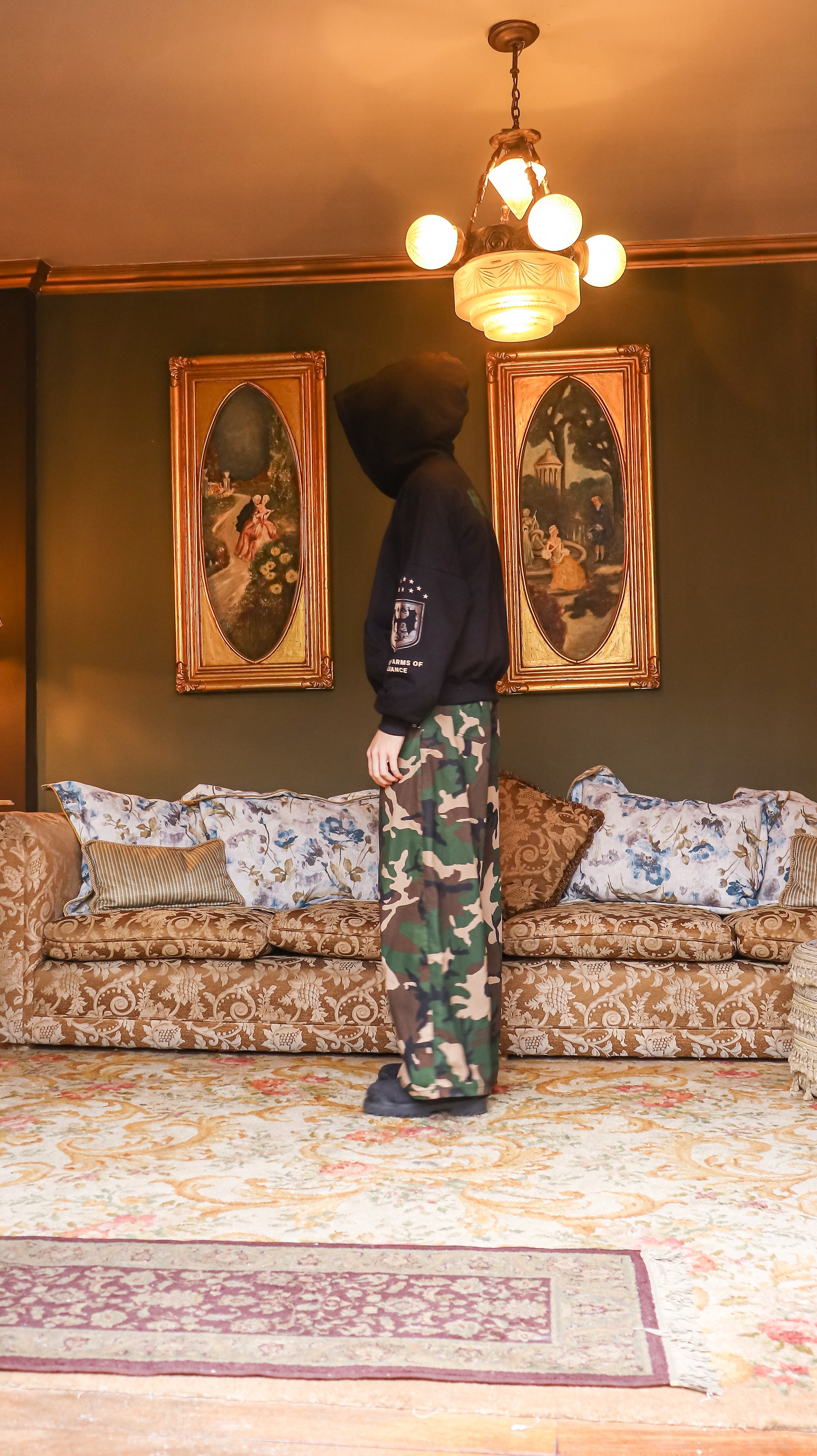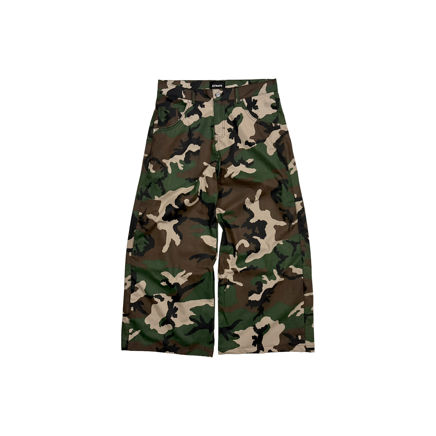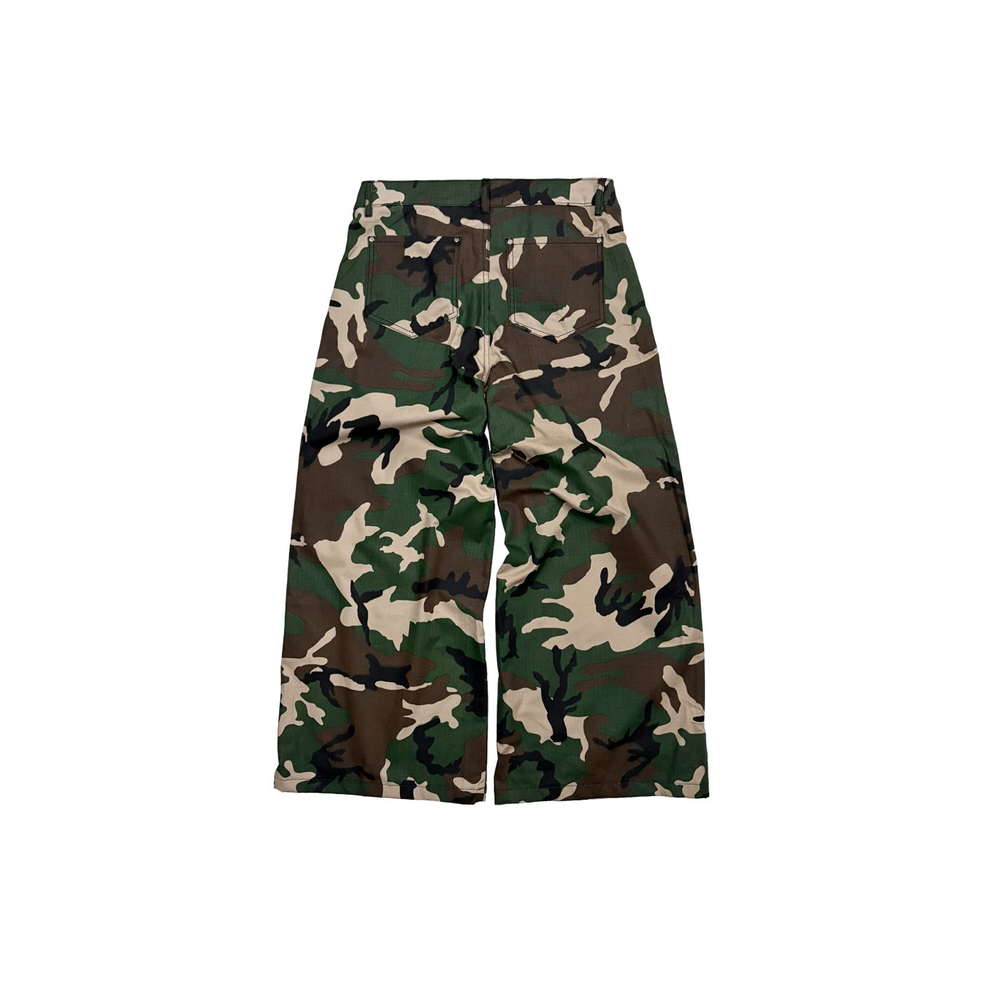 Pantalon de corte super baggy confeccionado en algodón ripstop, un tejido resistente con estructura cuadriculada que ayuda a conservar su volumen y forma.