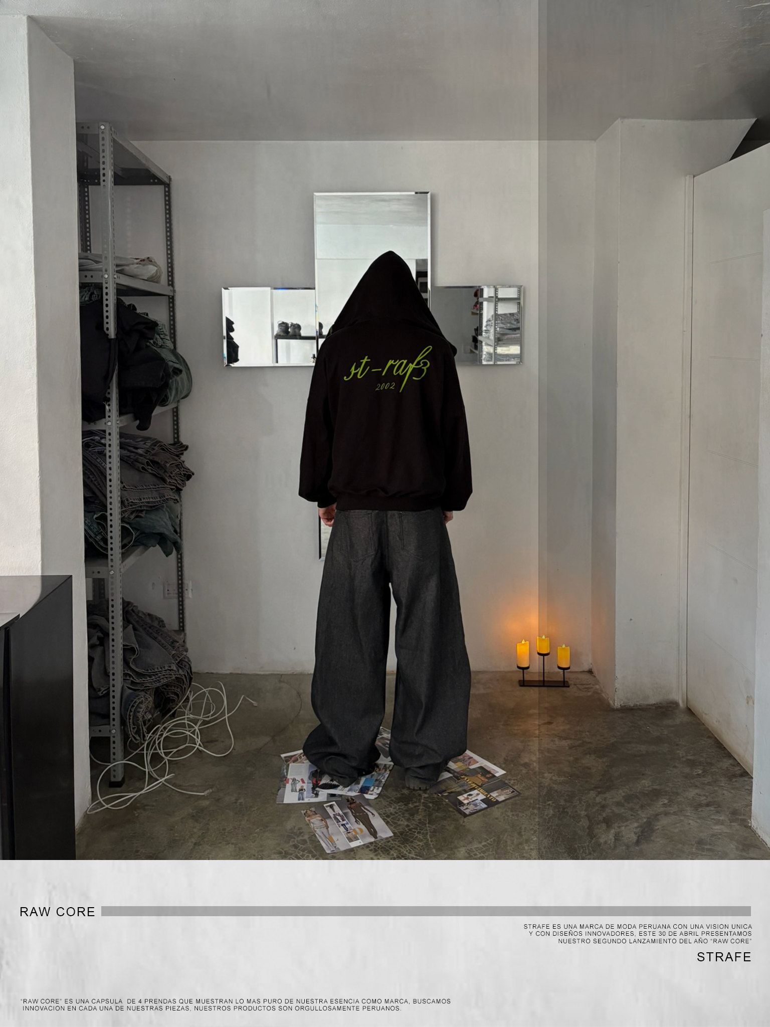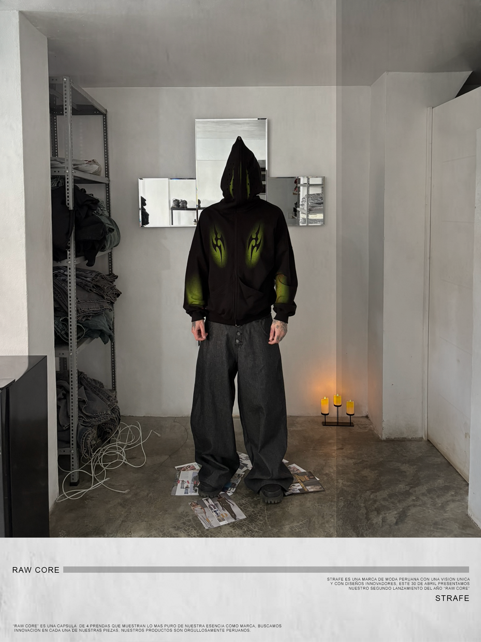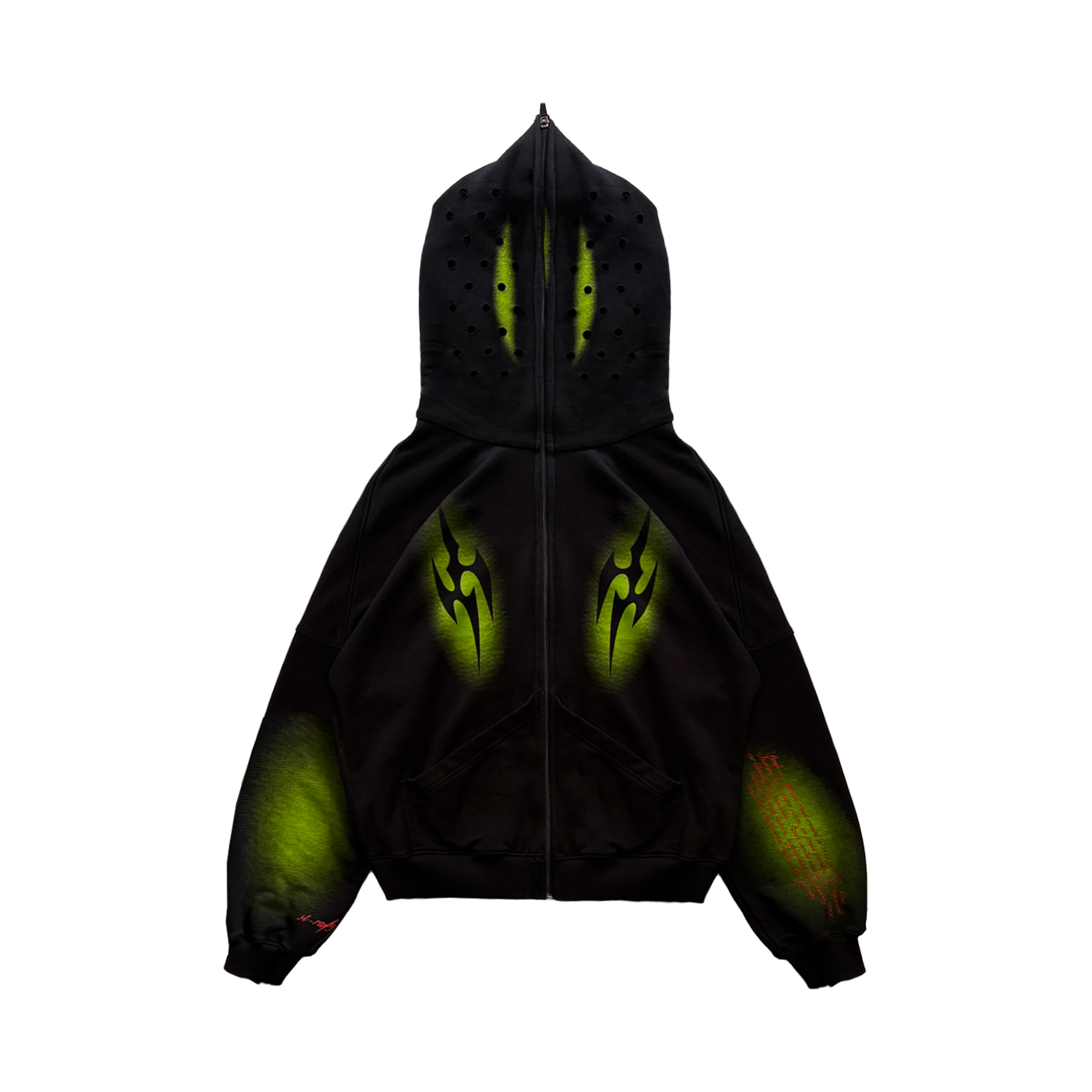 Cuenta con un diseño único en toda la prenda, pero su diseño mas innovador se encuentra en la capucha, tiene huecos estratégicos hechos por un maquina de laser industrial para que cuando decidas cerrar toda la cremallera puedas ver a través de los huecos, dando un look totalmente único a la prenda.
