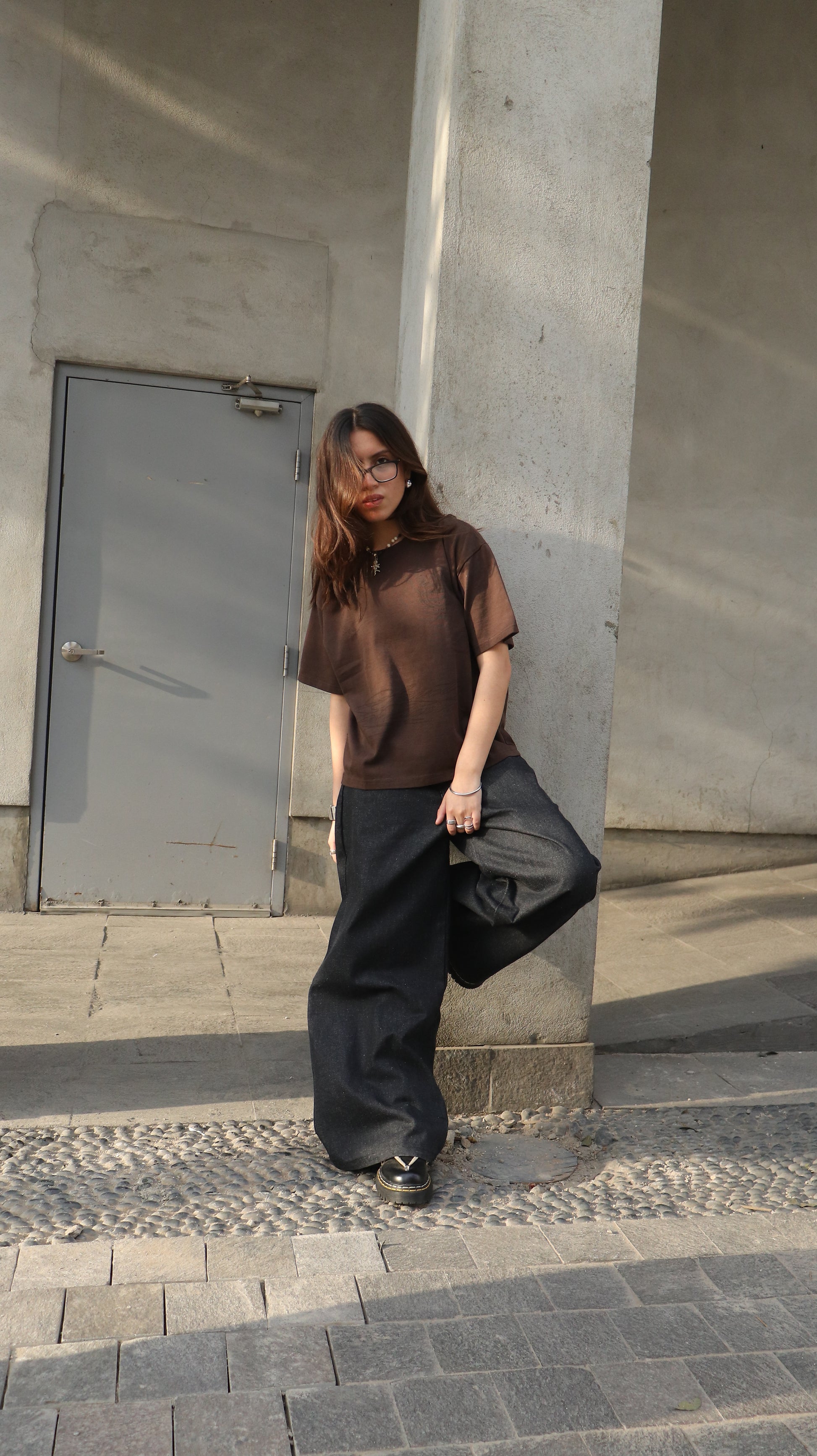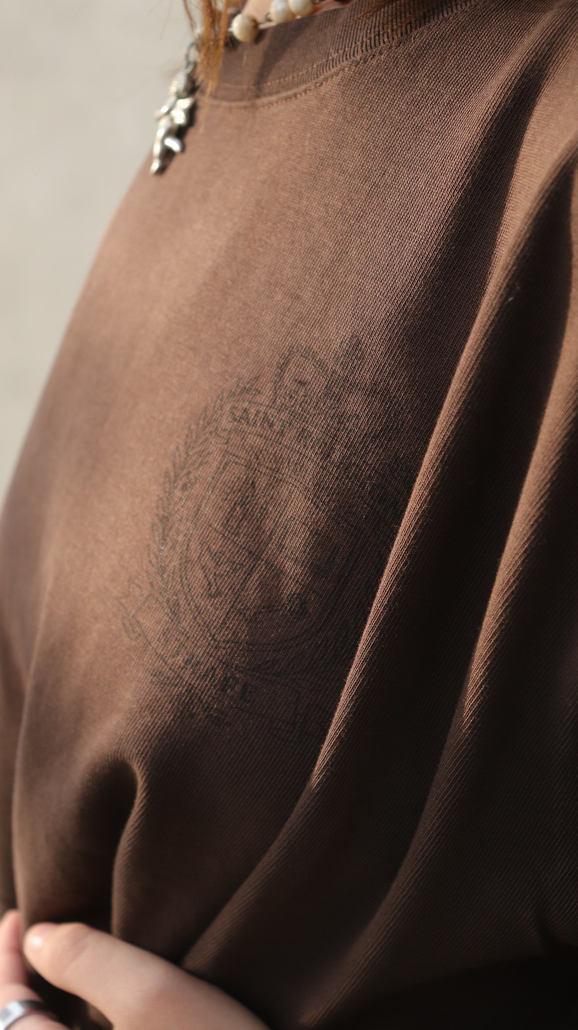 Prenda confeccionada en algodón pesado de alta calidad, que garantiza resistencia, durabilidad y una caída estructurada. Su tonalidad marrón se complementa con un estampado en negro de carácter discreto, diseñado para permanecer casi imperceptible, aportando un detalle sutil y sofisticado. El corte es regular con silueta ligeramente corta, otorgando un balance.